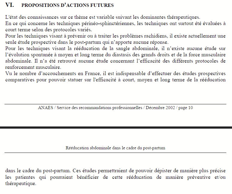 Mais, faisons une parenthèse. Puisqu’il y a un grand n’importe quoi entre le traitement du diastasis qu’on confond avec le traitement des dysfonctions abdominales ou encore du plancher pelvien, du périnée. Alors on peut s’attarder sur les études sur le sujet. Bon le renforcement abdominal renforce les abdominaux, ça il n’y a pas besoin de chercher, mais surtout dans ce contexte, il est primordial de préciser que le réentraînement des muscles du périnée est efficace pour lutter contre les troubles du plancher pelvien et c’est essentiel, car se réentrainer, c’est bouger, c’est être actif mais surtout prendre le temps de faire une activité pour soi, qui doit être plaisante !